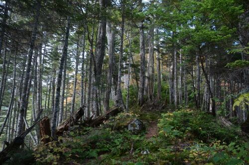 標高1500m前後の開田の登山口からしばらくは、苔で覆われた森が続いていた。 ゆっくりと静寂の森を楽しみながら足を進める。 森を抜け稜線に出、左右に明るい空が広がり始めると、森が明るくなり林床の様子が変わってきた。 森はどこまでも続く。 開田道は…
